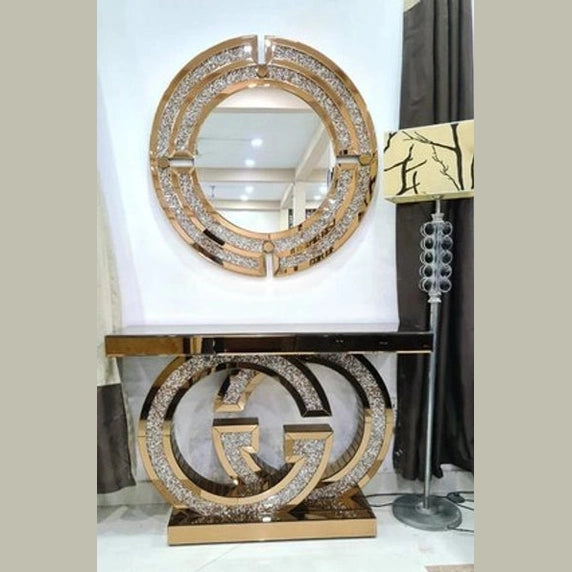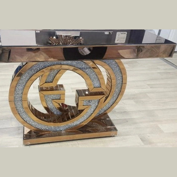 Make a bold style statement with this stunning mirrored console table, featuring an iconic Double G-inspired design. This exclusive piece is the epitome of sophistication, combining golden mirror accents with crushed crystal embellishments for a look that is both modern and opulent.