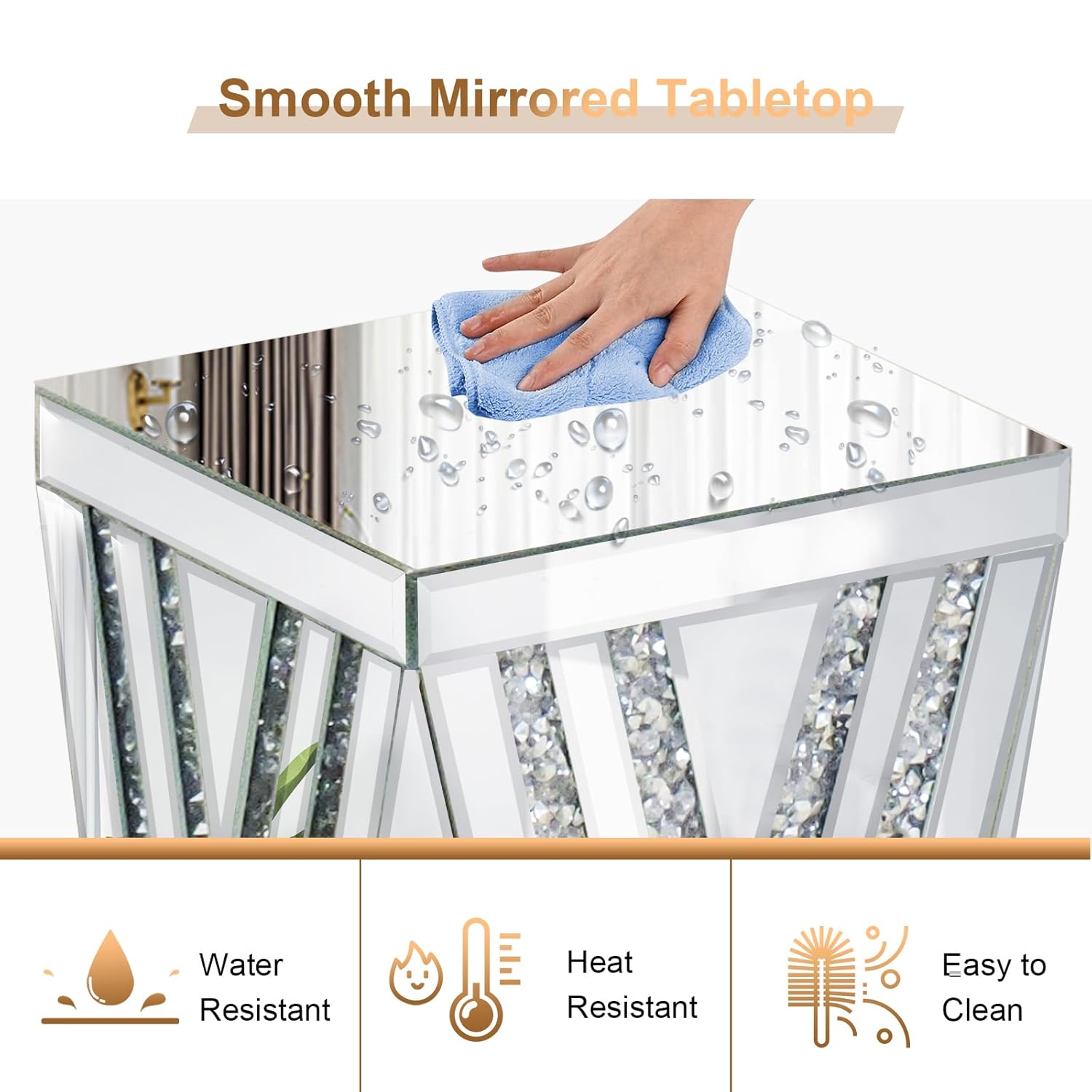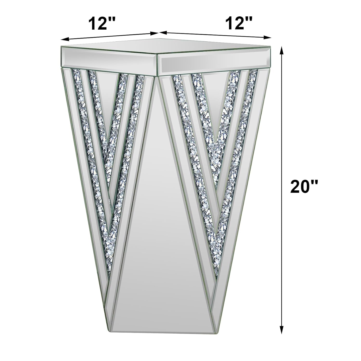Make a bold style statement with this stunning mirrored accent table, featuring a dazzling V-shaped crystal inlay. Designed to reflect light beautifully and add a touch of luxury, this contemporary piece is perfect for elevating your living space with sophistication and charm.