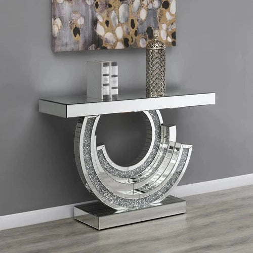Upgrade your space with this stunning silver mirrored console table, designed to exude elegance and sophistication. Featuring a bold circular base with dazzling crushed crystal inlays, this masterpiece is a perfect blend of modern glam and timeless beauty.