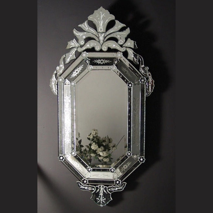 A masterpiece of Venetian artistry, this mirror brings a touch of luxury and sophistication to any space. With its hand-etched floral motifs, beveled edges, and intricate detailing, it reflects timeless craftsmanship.