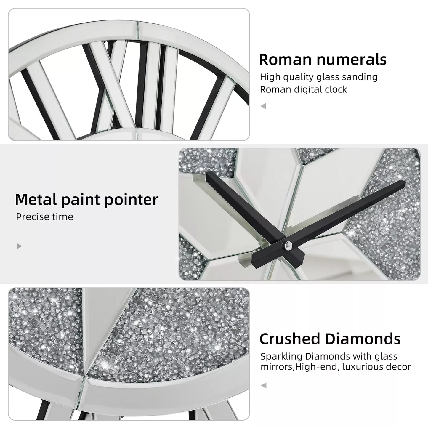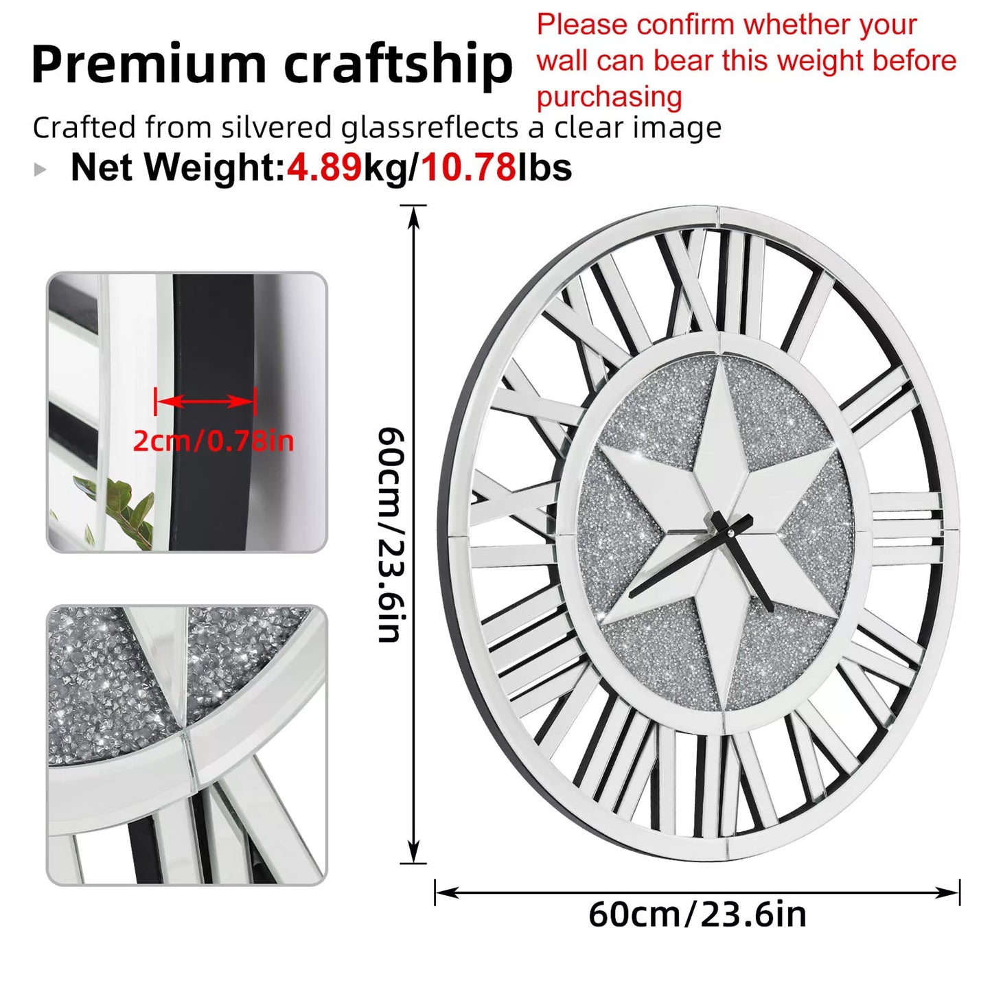 Transform your space with this breathtaking crystal star mirrored wall clock, a fusion of modern elegance and timeless design. Featuring a striking five-point star centerpiece with crushed diamond inlay, this clock is more than just a timepiece—it's a work of art.
