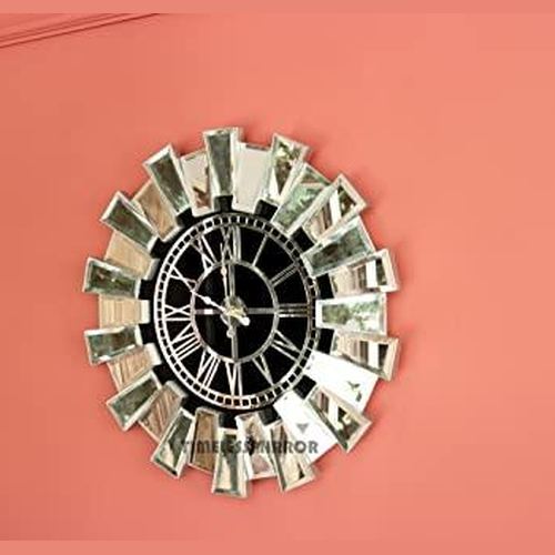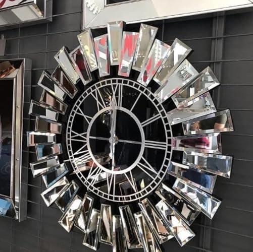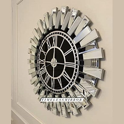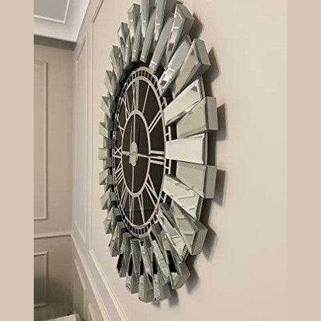 Add a touch of luxury to your interiors with this stunning sunburst mirrored wall clock. Designed to captivate attention, its intricate sunburst frame with beveled mirror accents reflects light beautifully, creating a sophisticated and glamorous ambiance in any space.