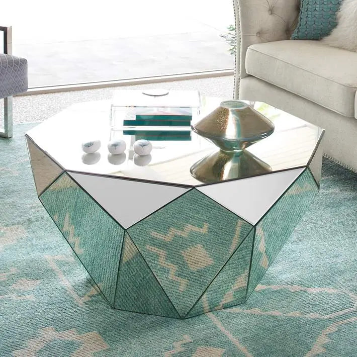 The faceted mirrored panels add depth and dimension, while the sturdy engineered wood construction ensures long-lasting durability. Whether styled as a statement centerpiece or paired with plush seating, this unique coffee table exudes elegance and contemporary charm.