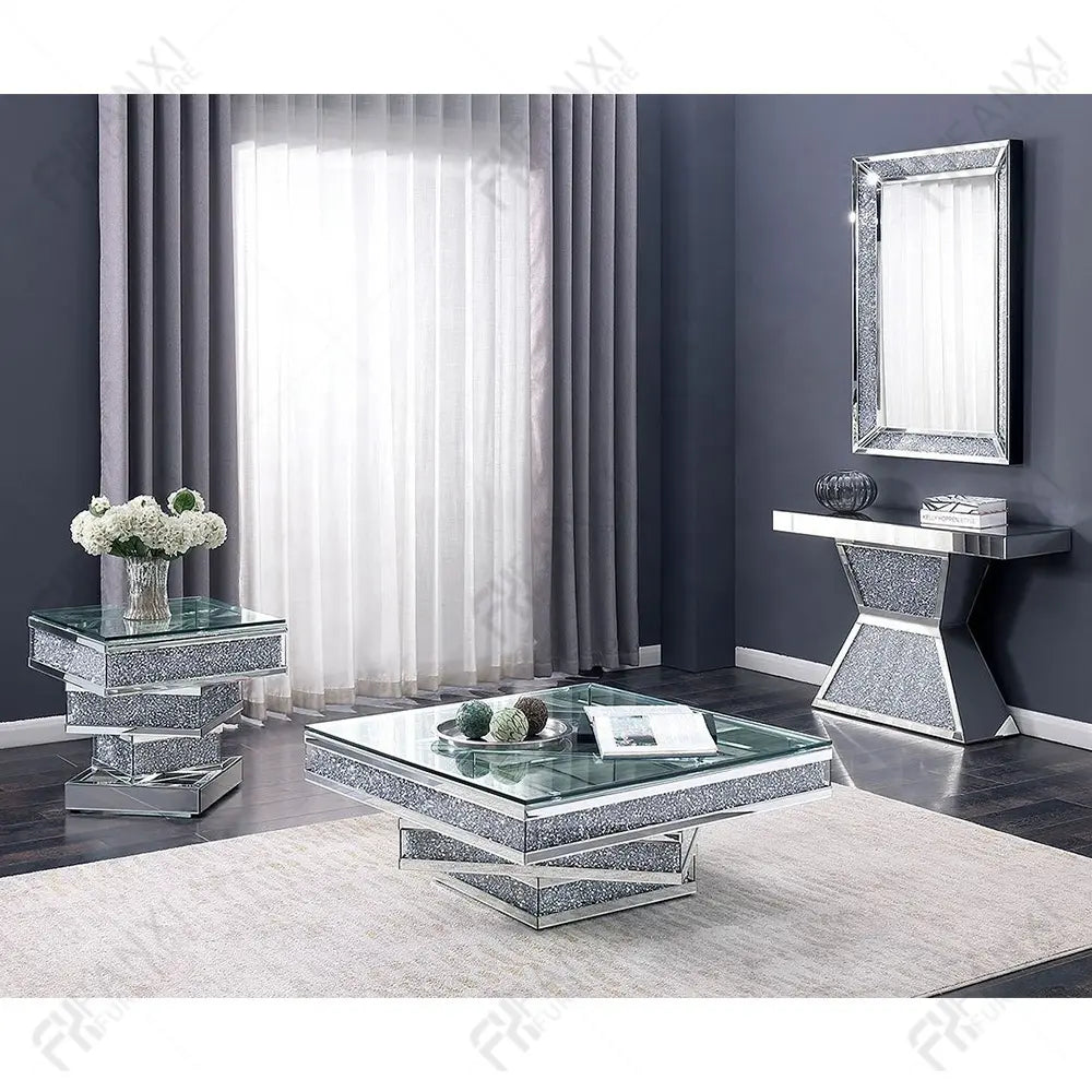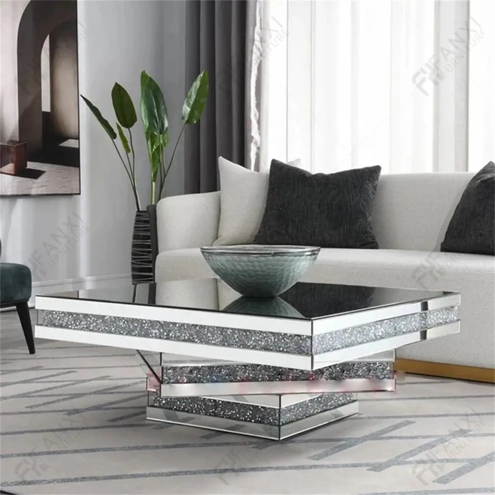 Luxury Mirrored Coffee Table with Crushed Diamond Inlay – Modern Glam